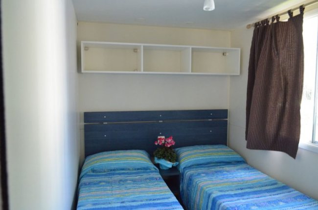 Casa mobile trilocale; aria condizionata; 1 camera con letto alla francese; 1 camera con 2 letti singoli; area giorno con angolo cottura (NO pentolame); frigo con piccolo freezer; dinette; tv; due bagni separati, uno con cabina doccia e lavandino e l’altro con servizi. Veranda esterna attrezzato con tavolo e sedie.