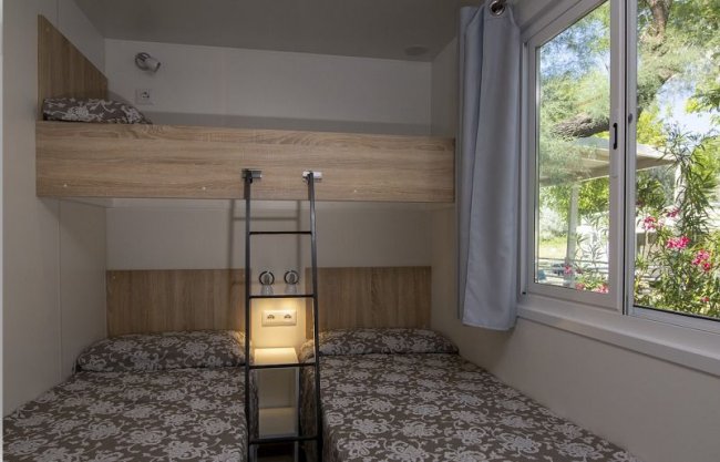 casa mobile trilocale; aria condizionata; area giorno con angolo cottura, frigo a colonna; tv; 1a camera con letto matrimoniale; 2a camera con 2 letti singoli + 1 letto di dimensioni ridotte attaccato alla parete (adatto ad una persona di massimo 150 cm e 60 kg); bagno con box doccia e bidet. Veranda esterna coperta.
